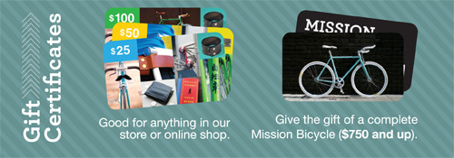 Ditch the guesswork with a gift certificate. Available in denominations of $25 up through a complete custom Mission Bicycle.