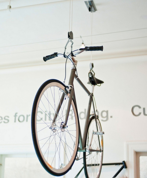 Often found in suburban garages, this simple but effective hoist can be installed anywhere. A locking pulley and two versatile claws will safely and easily hold a bike (or most things for that matter) up to 50lbs.