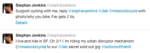 Lead singer of Third Eye Blind, Stephan Jenkins - who lives and rides in San Francisco, will be riding his Mission Bicycle to thier secret show at Bottom of the Hill on Monday.