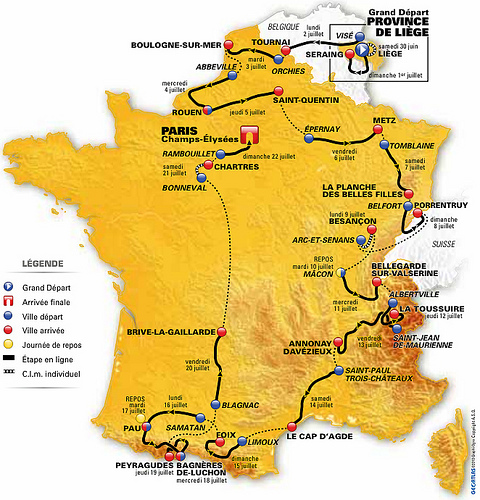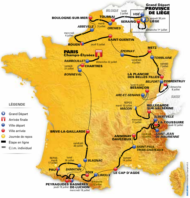 The scope of the race is consistent but the specific towns on the course vary each year. This year's Tour covers over 2,000 miles, with only 2 days of rest. The riders will average 103 miles per day for 3 weeks straight.