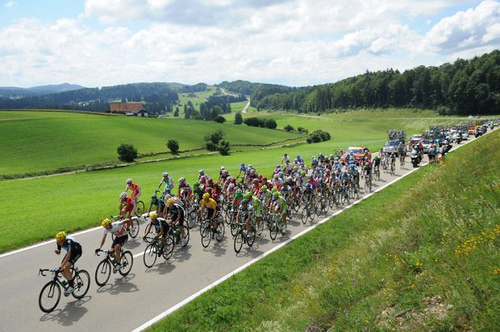 The peloton is followed by a swarm of photographers on scooters and team support cars carrying coaches, mechanics and parts. If a rider gets a flat tire or crashes, the support car will zoom up and deliver a new wheel or bike. Occasionally the scooters will crash into riders, spectators or each other.