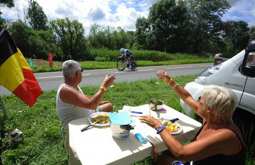 The course, which is simply the streets of France, is full of spectators. Fans are only restricted in certain areas on crowded city streets. In the countryside they park RVs in wheat fields, dress up in costumes and run down the road with their favorite riders. It's a well learned dance at this point.
