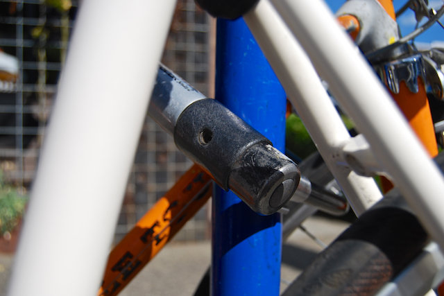 The key-slot of your U-lock should always face out, away from the rack. This keeps your scratchy keys away from any adjacent bikes.