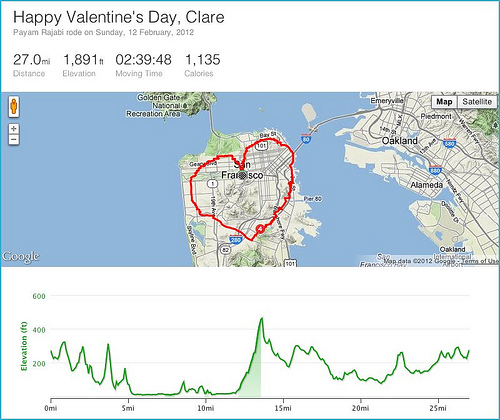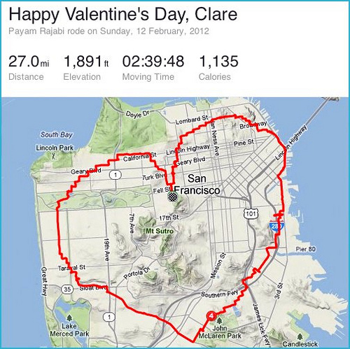 Using his iPhone, a GPS app, his Mission Bicycle and a heart as big as... well as big as San Francisco, Payam took this ride for his girlfriend, Clare. She's in Toronto so they won't be able to spend the holiday together but he wanted to create his valentine in a unique way.