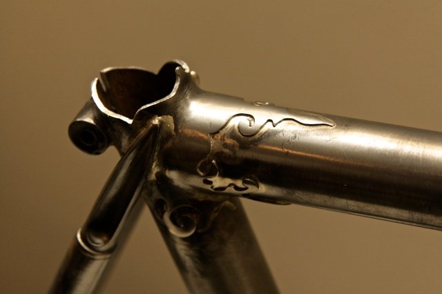 Above is a Mission frame made of 4130 chromoly steel that's been TIG (tungsten inert gas) welded. What you're seeing is raw steel tubing with a clear gloss powder coat.