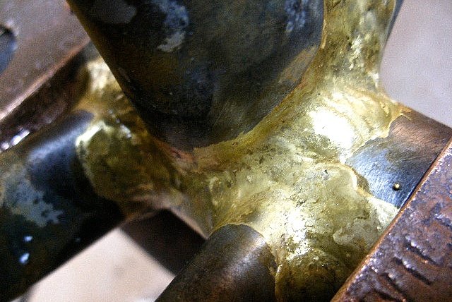 Above is the bottom bracket shell of a frame that's been fillet (pronounced "fill-it") brazed. The gold stuff is brass fillet joining the steel tubing. Fillet is usually applied thick, and then sanded smooth for a sculpted look.