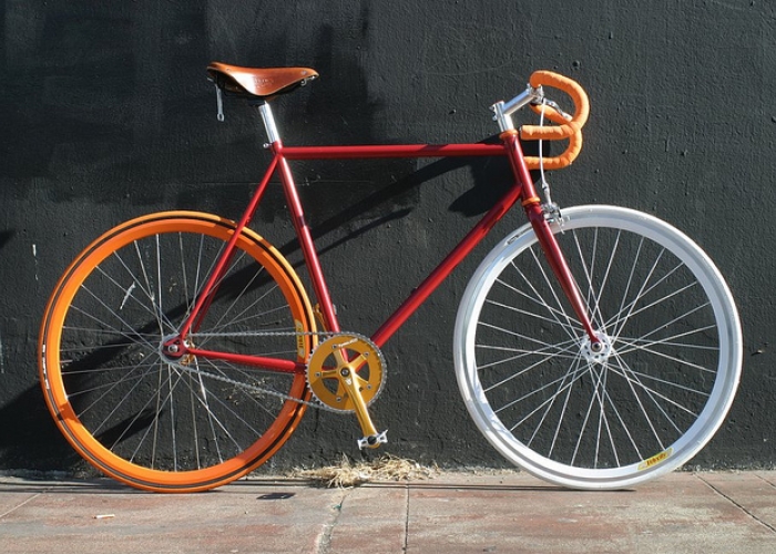 Here you have the Free City Classic. The color of the frame is a blood red that pops in the light, with a Safety Orange Deep V colored rear rim and Sugino Crankset. And topping it off a beautiful Brooks B17 saddle, style all the way.