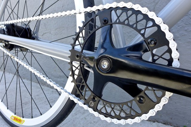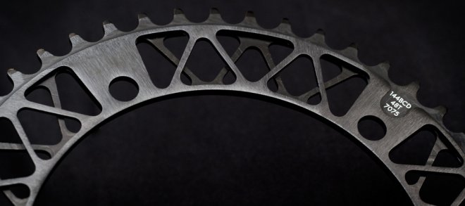 The ring is precision milled from a single piece of 7075 aluminum. This allows the lattice cutouts to originate from both sides for a woven effect. All the negative space gives the impression of fragility, but the execution is sculptural and the result is structural. 47 teeth, 1/8" thick, and ready to ride hard.