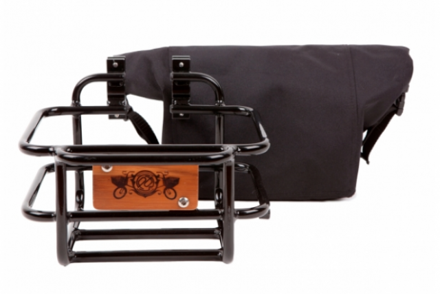 This rugged and lightweight basket doesn't require ugly steel stabilizing bars. It mounts right onto your handlebars and includes a water resistant (grocery-sized) roll-top bag.