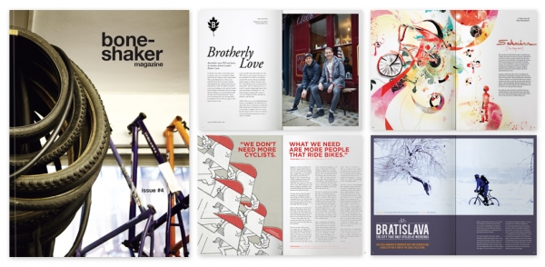 Boneshaker Magazine is a 60-page, perfectly bound, advertising-free publication full of articles, stories, and anecdotes about people and projects doing great things with bicycles.