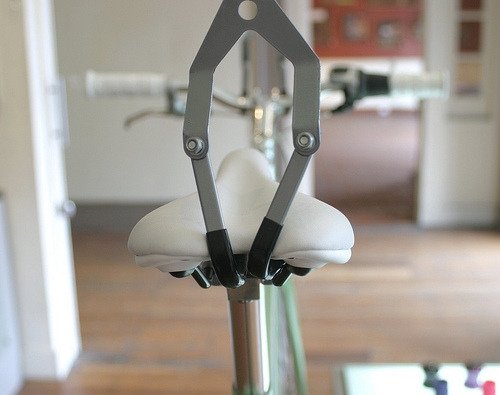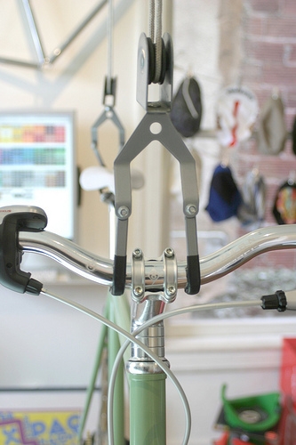 We use several of these in our shop, changing bikes out daily, to best utilize our space. The brackets mount directly into a ceiling joist and the pulley arms are adjustable to hold a variety of items: bikes, ladders, canoes, hammocks for small children and more.