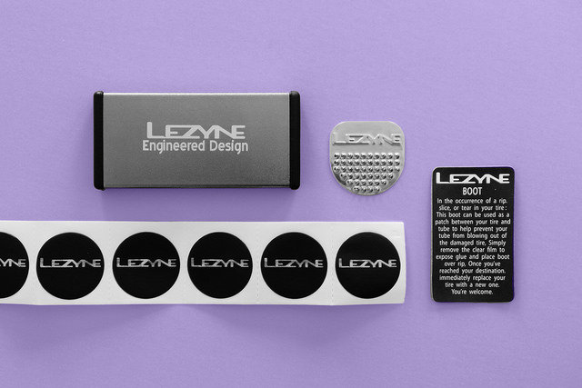Six peel-and-stick tube patches, one tire patch, and a stainless steel scuffer all inside a waterproof aluminum case. At this size and weight (30g) there's no reason to end up stranded.