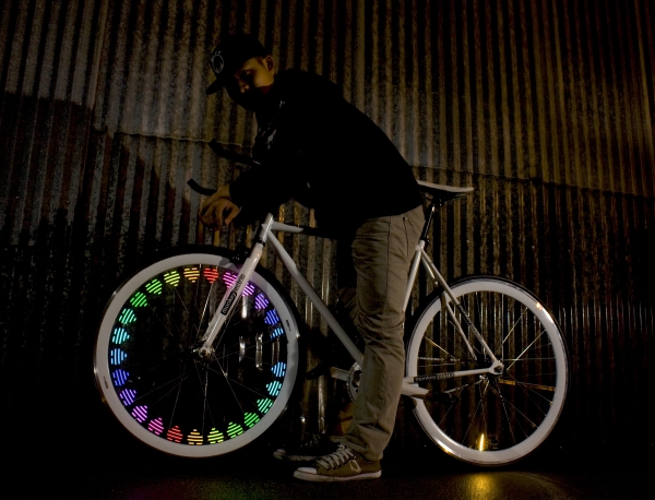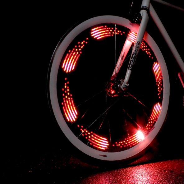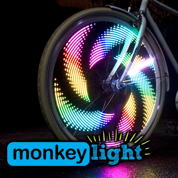 The MonkeyLectric light system is a kinetic new way to light your path. Rugged and weatherproof, the LED system mounts directly to your spokes and utilizes the rotation of your wheel to produce full color mesmerizing graphics. Powered by a few AA batteries, MonkeyLectric keeps you visible, and all those you pass by amazed.